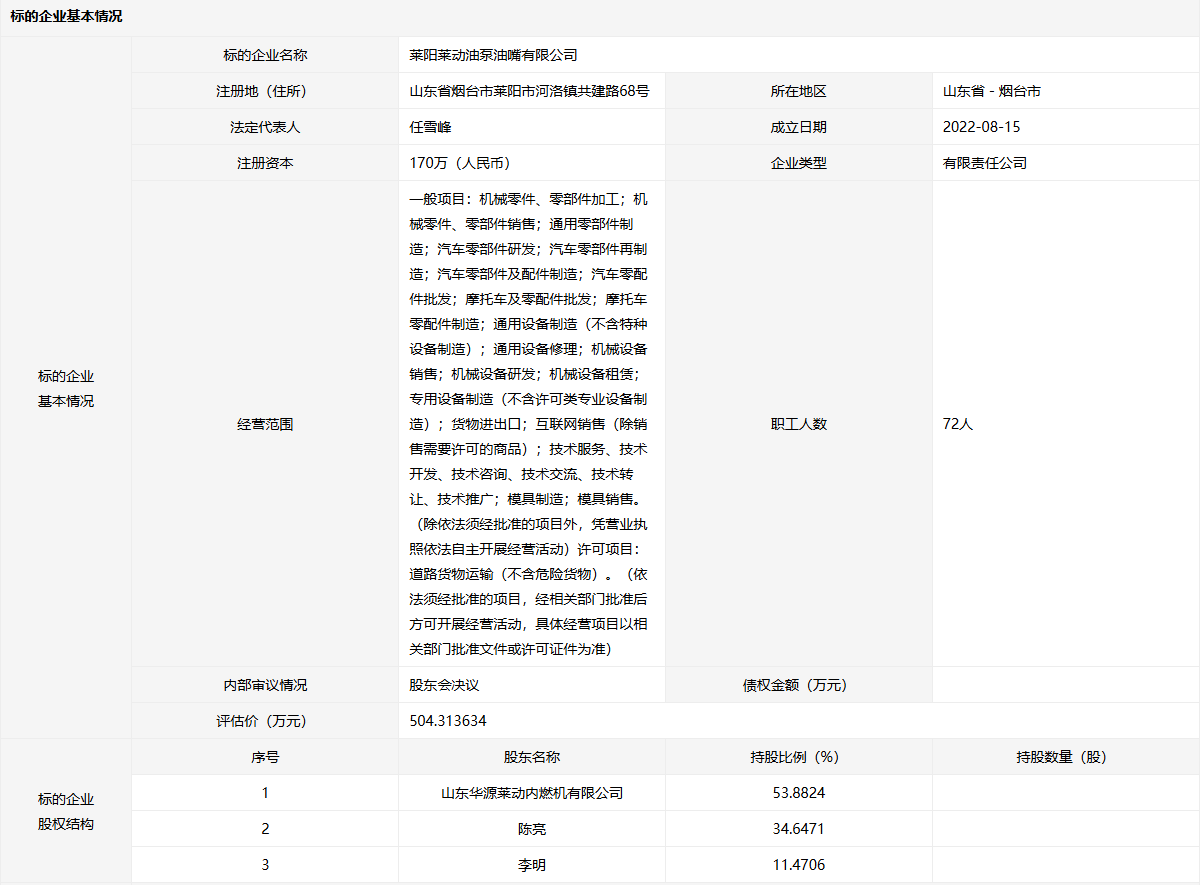 萊陽萊動油泵油嘴有限公司53.8824%股權