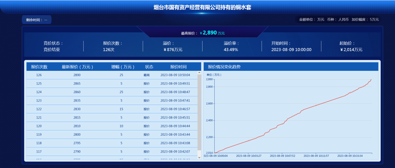 8月9日,煙臺(tái)市國(guó)有資產(chǎn)經(jīng)營(yíng)有限公司持有的銅水套項(xiàng)目通過(guò)網(wǎng)絡(luò)競(jìng)價(jià)的方式公開(kāi)競(jìng)價(jià),18名意向受讓方經(jīng)過(guò)126次激烈競(jìng)價(jià),最終以2890萬(wàn)元的價(jià)格成交,溢價(jià)876萬(wàn)元,溢價(jià)率43.49%。